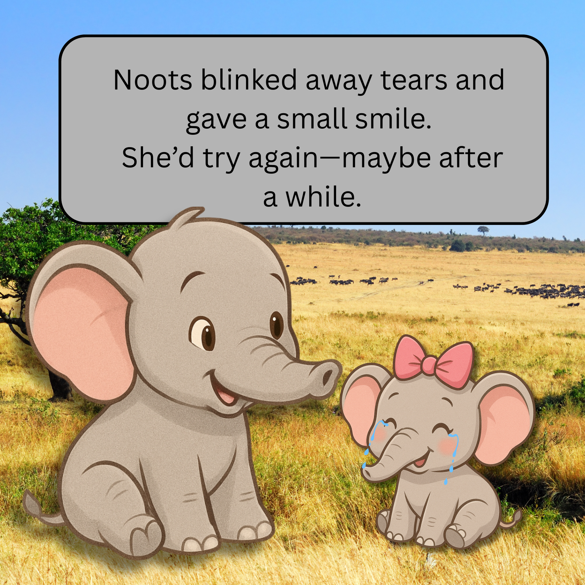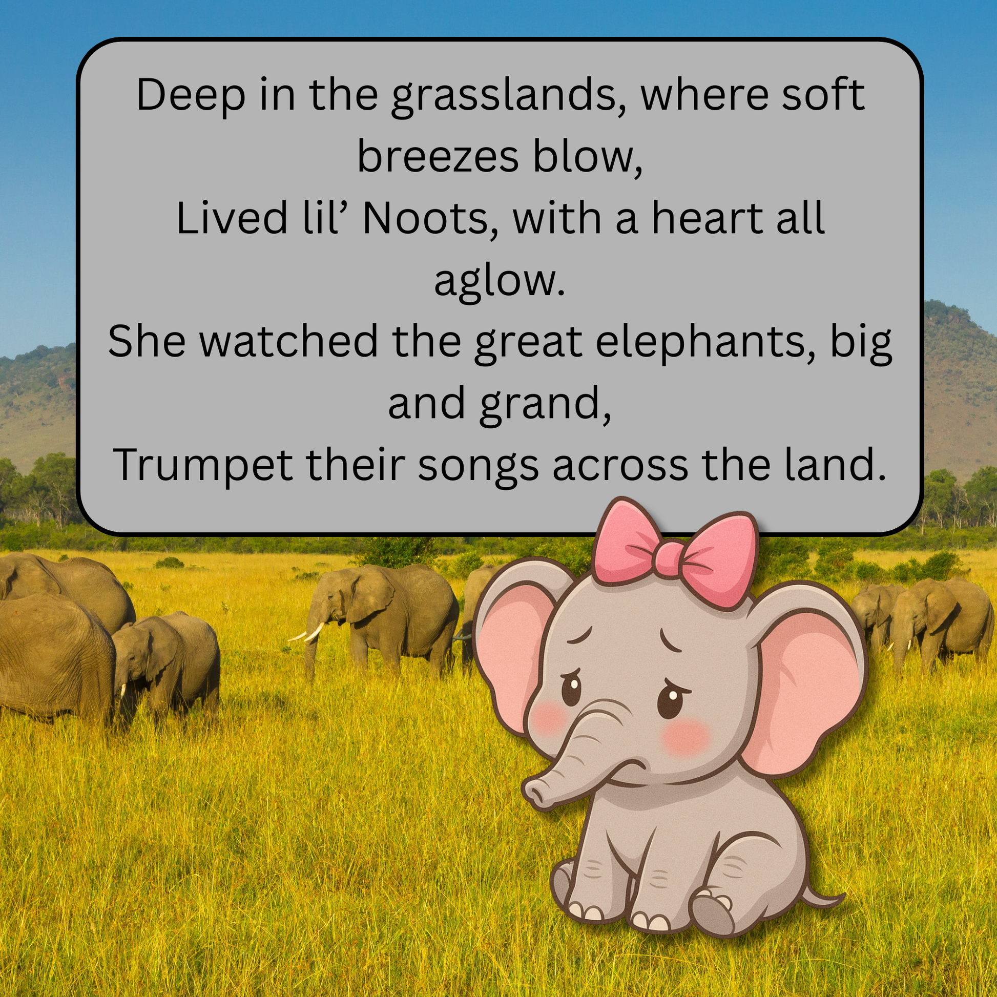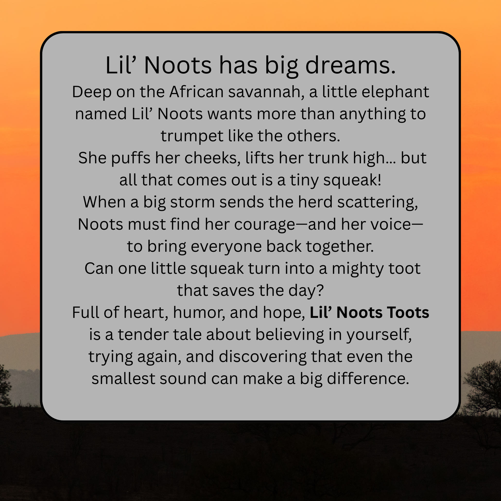Lil' Noots has big dreams. She watches the other elephants lift their trunks and let loose proud, booming trumpets across the savanna. She wants to toot too-really toot! But when Noots takes a deep breath and gives it everything, all she gets is a tiny squeak. Time and time again, she tries and squeaks, watching hope and doubt swirl together. Then her friend, Ben, gently reminds her: You're more than your trumpet, you're kind, you're brave, you help the other animals-one day you'll find your voice. When the herd faces a storm, and Noot's is the only one nearby, she gathers every squeak and every effort she's made, and she toots! Join Noots on her journey of learning and discovering these little life lessons. Never give up on yourself and always keep trying, no matter how many failed attempts you receive. A sweet adventure where Lil’ Noots discovers that confidence and courage matter more than making the biggest toot.